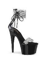 Pleaser 7" Heel, 2 3/4" PF Ankle Cuff Sandal w/Rhinestone, Back Zip, Clear-Black/Black