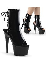 Pleaser 6" Heel, 2 1/4" PF Open Toe/Heel Ankle Boot, Side Zip, Black Patent
