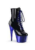 Pleaser 7" Stiletto Heel Lace-Up Platform Ankle Boot, Side Zip Black Patent/Royal Blue Chrome