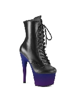 Pleaser 7" Heel, 2 3/4" Platform Lace-Up Ankle Boot, Side Zip Black Faux Leather/Blue-Purple Ombre