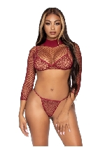 3 Pc Industrial Net Bikini Top G-String and Long Sleeved Crop Top Burgundy OS