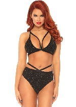 2 Pc Shimmer Lurex Opaque Cage Strap Bra Top and Matching Strappy Brazilian Bottom - Black/ Gold - Small/medium