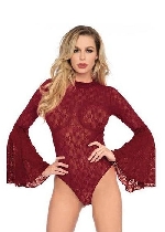 Leg Avenue High Neck Stretch Lace Bell Sleeve Bodysuit-One Size-Burgundy