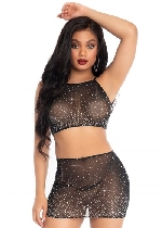 2 Pc Rhinestone Crop Top and Mini Skirt Black