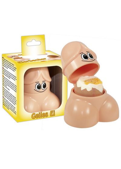 Penis/testicle-shaped egg cup. The glans serves as a cover. Measures: width approx. 8.5 cm, height 8 cm, depth 6.5 cm. Material: PS (polystyrene)