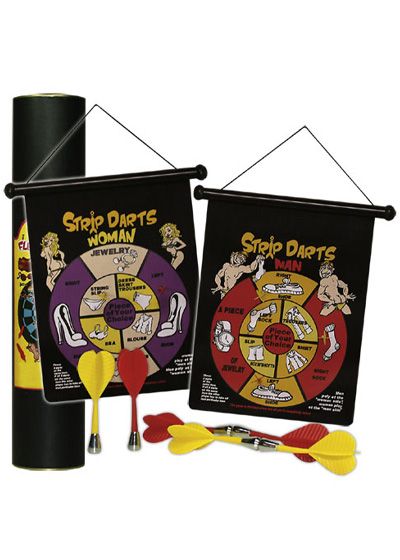 The classic darts game now with the little extra feature. With one magnetic board and 6 darts, female-players front and male-players back. Every field marks a piece of garment that must be taken off when hit. The board can be rolled up for easy storage.
