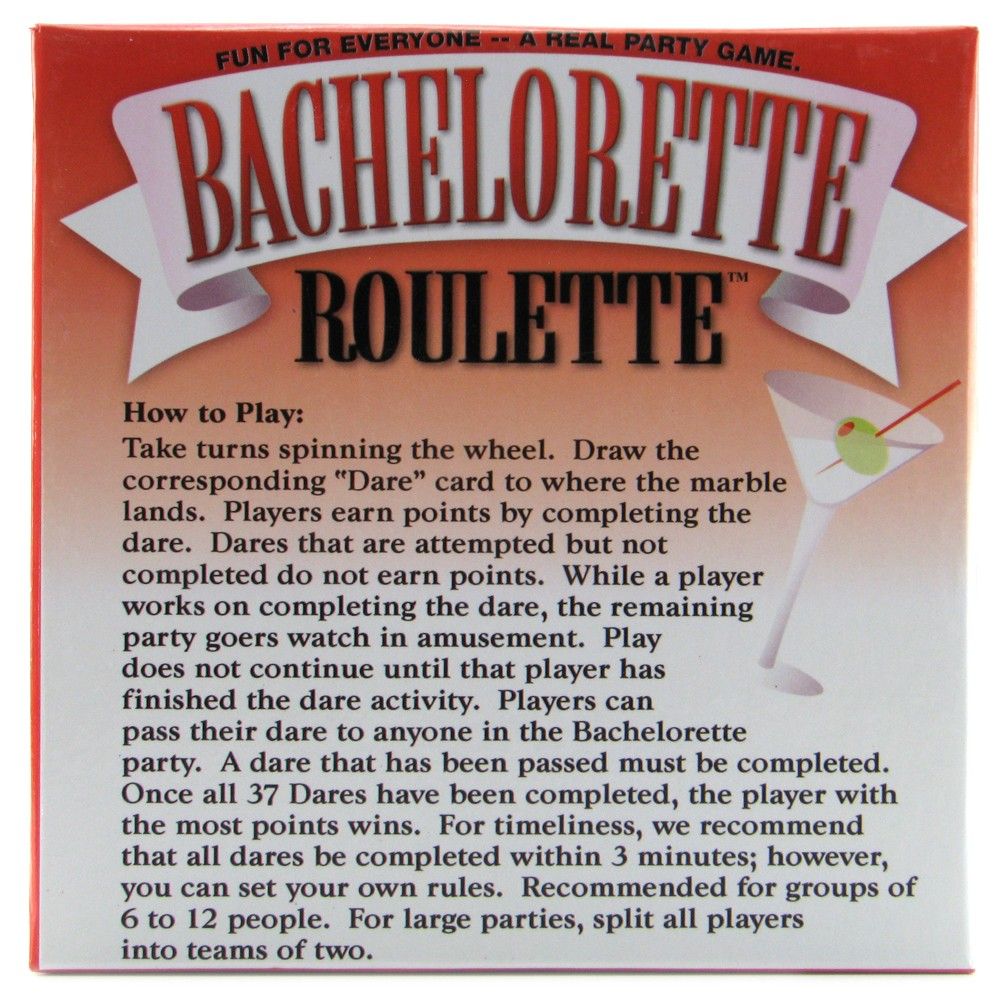 A daring game of chance for unforgettable bachelorette shindigs, Bachelorette Roulette is simple, completely interactive, and fulfills the required amount of party shenanigans on her last night of single-hood. 37 cheeky dares are included, they're selected by obeying the numbered card that the roulette wheel lands on. Dares included 'Flash a guy your bra', 'Get a guy to ask out one of your friends', 'Retrieve a condom from a guy', and 'Do a body shot off a guy.' Recommended for groups of 6 to 12 people.