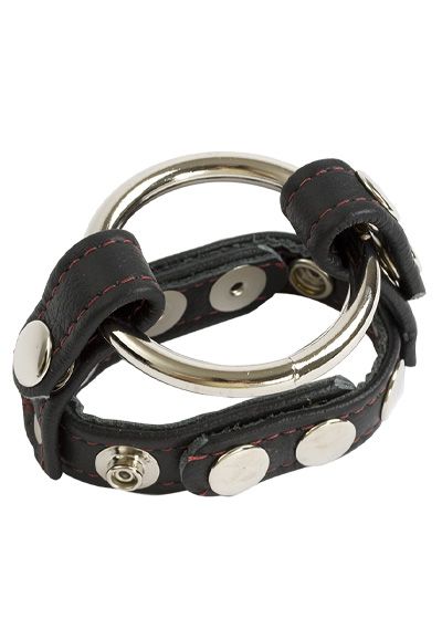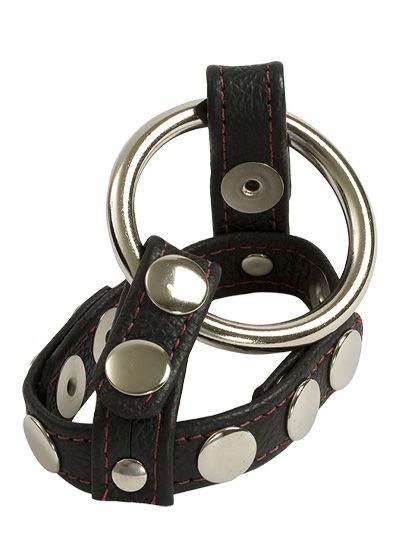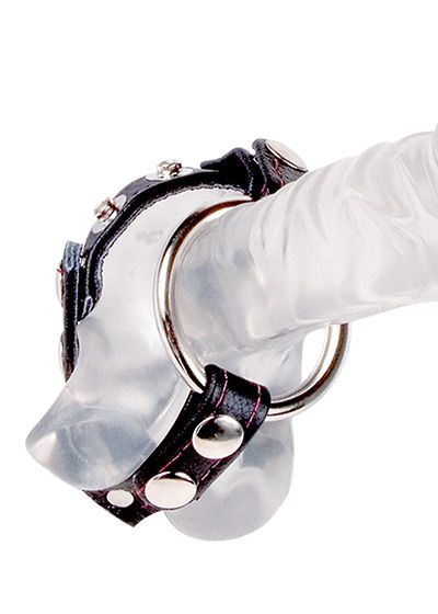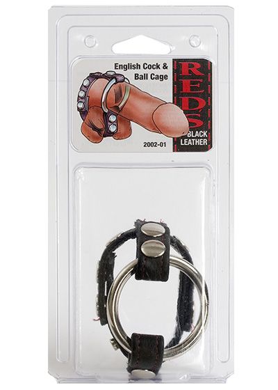 Toughen up the look of your package and keep everything under control with the English Cock and Ball Cage by Doc Johnson. It's made of high quality, classy black leather, and accesorized with chrome colored metal. The leather straps are easily adjustable using snaps, and the metal ring fits most, with a girth of about 5 1/2 inches around.