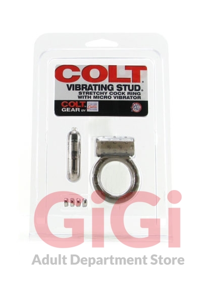 Add extra stamina and much more stimulation to playtime with the textured, pleasure inducing Vibrating Stud ring from Colt. This stretchy, comfortable ring is worn around the base of the penis and under the testicles to help keep blood where it counts, and in turn, keep you harder for longer so you can satisfy your playmate and also enjoy more intense orgasms yourself. It can also be used over-top of a dildo or vibe; regardless, during penetration the specially angled, intensely nubby stimulator will add that extra bit of pleasure to your partners experience, and your own. Just slip the sleek little bullet vibe through the texture4d portion up top to make use of powerful vibration-a simple push button starts things up. The body safe, phthalate free elastomer material is easy to clean and tends to be hypoallergenic, perfect for those with sensitive skin- just be sure to use a water based lube with this toy to keep the material strong and lasting. One size fits most. Vibe requires 4 LR41 cell batteries, which are included.