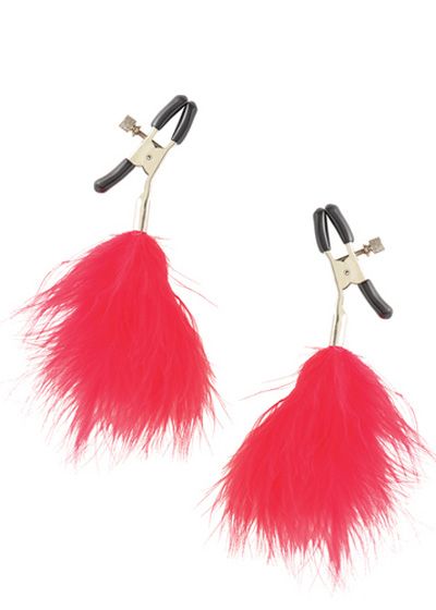 Make those nipples perk with intense pleasure with the Beginner Feather Nipple Clamps by Pipedream! Made with a durable metal and covered in a soft rubber liner, these clamps are perfect for people just getting into bdsm and master fetishists alike! Turn the screw to change the amount of pressure applied to the nipple, while the soft feather streamers tease, tickle and titillate!