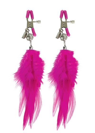 Make your nipples perk with pleasure with these beginner Fancy Feather Nipple Clamps. Made with durable metal clips and covered in soft rubber liners, these clamps are perfect for beginners and fetish enthusiasts alike. The amount of pressure you apply to the nipple is adjustable by turning the screw, while the soft feather streamers tease, tickle and titillate! Materials: Metal, Feather.