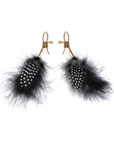 Make your nipples perk with pleasure with these beginner Deluxe Feather Clamps. Made with durable metal clips and covered in soft rubber liners, these clamps are perfect for beginners and fetish enthusiasts alike. The amount of pressure you apply to the nipple is adjustable by turning the screw, while the soft feather streamers tease, tickle and titillate!