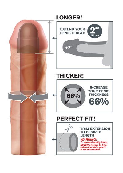 The Mega 2″ Extension is a customizable extension that can be easily trimmed at the base for a perfect fit. It's super-stretchy to accommodate most sizes and snug enough to help you last longer. Your partner will enjoy deeper penetration with the 2″ extension at the tip, while the ultra-lifelike shaft makes you 66% thicker all around. The soft Fanta Flesh material feels just like a second skin, giving you the length, girth, and confidence you need to satisfy your lover.