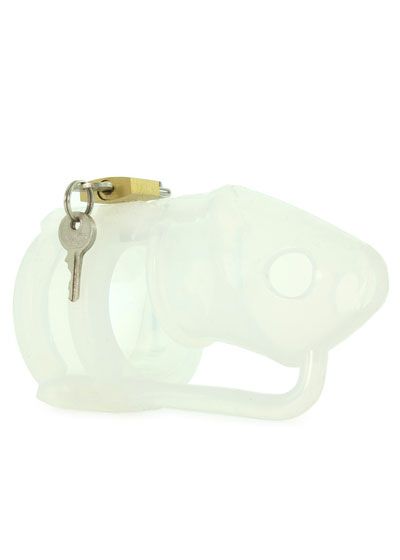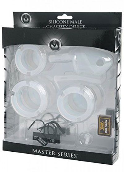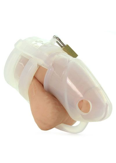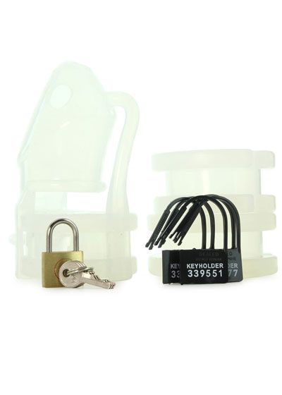 Sexual denial has never been this comfortably restrictive. Flexible and lightweight, the Sado Chamber Chastity Cage is designed for long term wear. This intriguing confinement piece will hold them in submission for extended periods, while remaining undetected under clothing. The cage and rings are made entirely of premium silicone. Choose one of the 3 provided rings, place it behind the cock and balls, then slide the cage over the penis. Slide the straps of the tie down straps through the cage. Lock them up using either the included padlock of individually numbered temporary locks. The cage of the piece is outfitted with ventilation holes, allowing the wearer to wash without removal. The Sado Chamber comes complete with a silicone cock cage, three sized rings, two tie down straps, a padlock with two keys, and five individually numbered plastic locks. Measurements: Rings: 1.5, 1.75, and 2 inches in diameter; Cage: 4.35 inches in length, 1.25 inches in diameter. Material: Silicone, plastic, metal. Color: Clear. Note: Contains cage, 3 rings, 2 plastic bands, lock and keys, and 5 plastic numbered locks