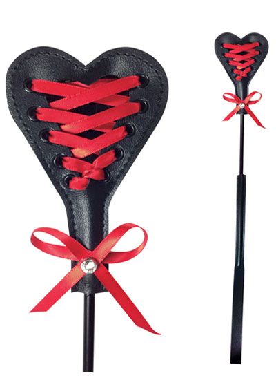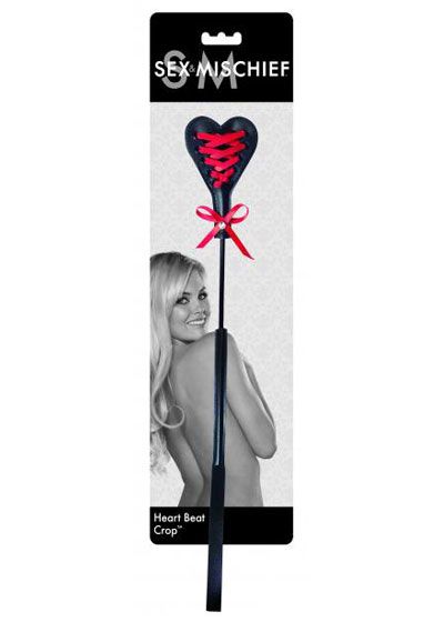 Create unique sensations with our new Heart Beat Crop. One side is smooth for spanking, stroking, and caressing. The other side features a plush red lace fabric tied up like a corset harness and is adorned with a blinged bow. The bling adds to the sting! Use this beautiful new addition to your collection to invent your own Sex and Mischief fantasy.