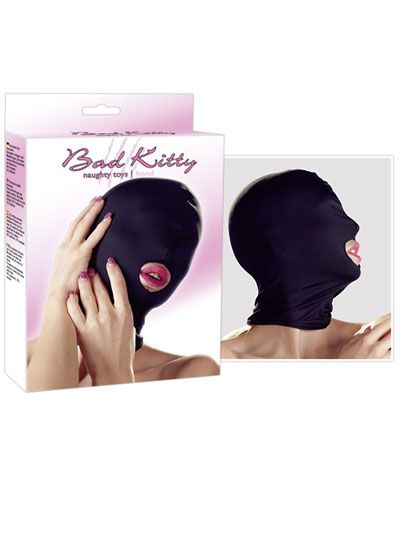 Tight black head mask with a hole for the mouth. Made of elastic material; 92% polyester, 8% elastane.