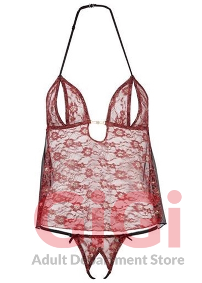 Flared Babydoll, open at the sides, with adjustable halterneck and glossy rhinestone adornment. String ouvert included. Both items made of delicate red lace with golden shine. 92% polyamide, 8% metal.
