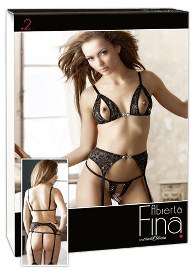 Soft bra with slitted cups, suspender belt and an inviting open string made out of delicate black lace with golden threads and heart shaped rhinestone decoration. Bra and suspender straps are adjustable. Bra with clip-fastener and suspender belt with hook-fastener. 67% polyamide, 25% polyester, 8% elastane.