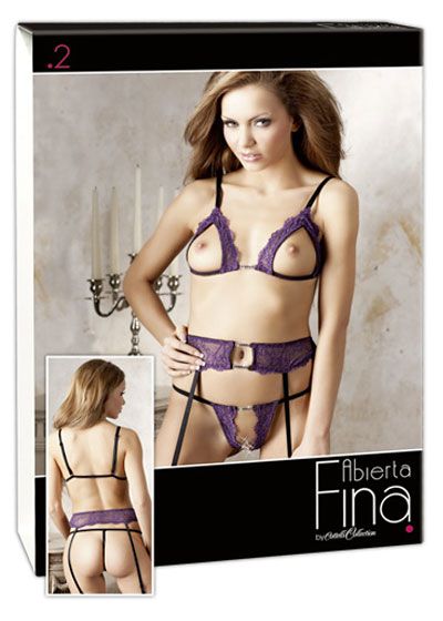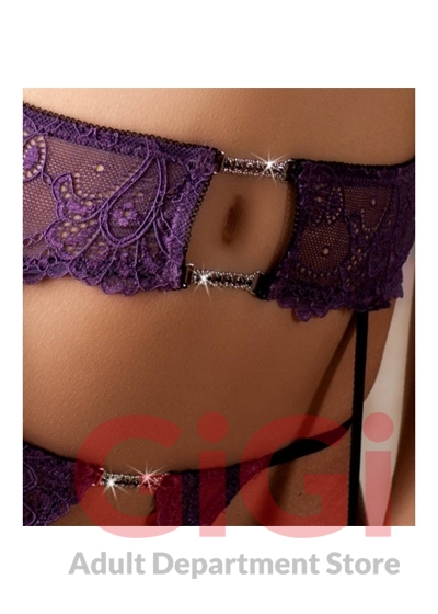 Purple coloured 3-piece set with decorative glittery rhinestone. Soft bra with slitted cups, adjustable straps and a clip-fastener at the back. Suspender belt with four adjustable straps. With matching crotchless string. For a perfect fit, all parts have black elastic straps. 90% polyamide, 10% elastane.