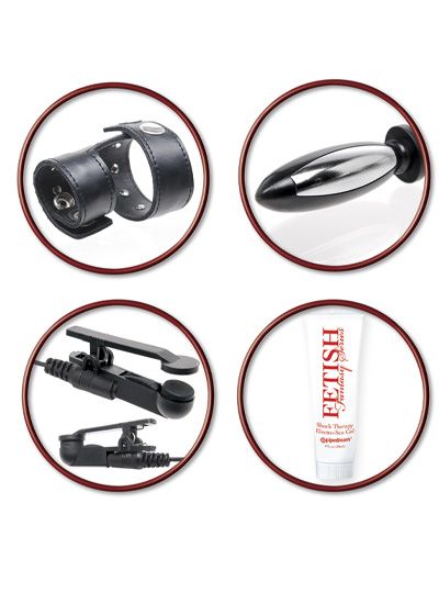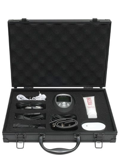 The Fetish Fantasy Deluxe Shock Therapy Travel Kit has everything you need in a handy black briefcase for many hours of state-of-the-art electro stimulation –– and massage of the nipples, buttocks, penis, vagina and ass.