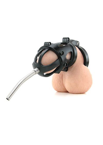 The Captive has a opening at the front for urine and otherwise, so it's suited for long term wear, if desired. Speaking of long term wear, a stainless steel urethral spout is also included, it can be secured to the front end of the cage through a threaded entry. While worn through the head of the penis, the spout allows urine and otherwise to pass through.