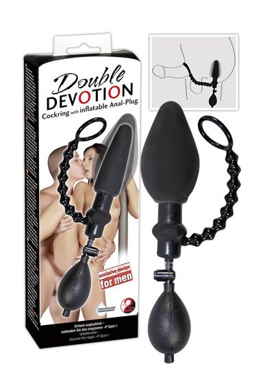 Inflatable butt plug with detachable pump ball and integrated beads chain (length 13 cm) with cock ring. Butt plug with outlet valve. Total length 29 cm, penetration depth approx. 10 cm. ø 2.5 cm - 4 cm (inflatable up to triple size). Black. Material: Latex, PVC, ABS, free of phthalates according to EU regulation REACH.