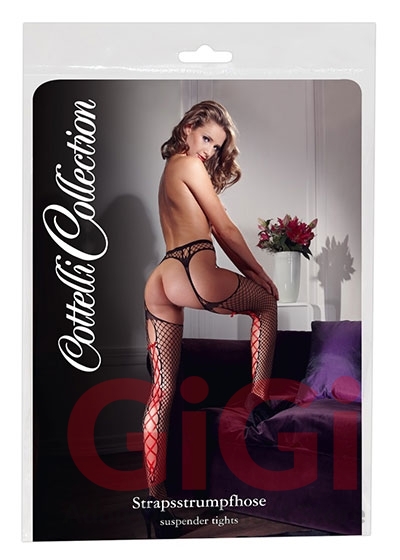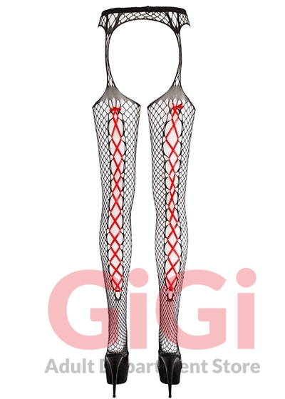 Stockings and suspender belts in one with a tempting open crotch - perfect for a quicky! Red coloured satin lace up at the back (attached). Black. 90% polyamide, 10% elastane.