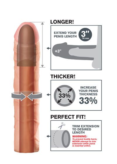 The Perfect 3″ Extension is a customizable extension that can be easily trimmed at the base for a perfect fit. It's super-stretchy to accommodate most sizes and snug enough to help you last longer. Your partner will enjoy deeper penetration with the 3″ extension at the tip, while the ultra-lifelike shaft makes you 33% thicker all around. The soft Fanta Flesh material feels just like a second skin, giving you the length, girth, and confidence you need to satisfy your lover.