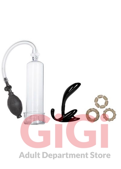 His Essential Pump Kit. Pliable and durable curved prostate probe for comfort and reach3 sturdy, stretchy all purpose rings. Penis pump with anged base for superior suction and EZ-squeeze bulb with quick air release valve. Removable body safe donut included for secure seal. Safe and pure for body and pleasure made using phthalate free materialsABS plastic cylinder, release valve, Thermoplastic Rubber TPR probe, donut, PVC bulb, Thermoplastic Elastomers TPE rings. 4.5 inches by 1 inch probe. 1 inch ring diameter.7.75 inches by 2.25 inches cylinder.