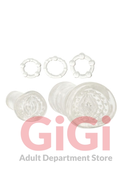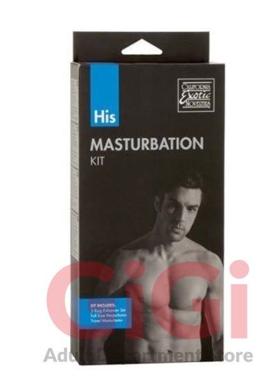His Masturbation Kit includes an ultra-stretchy compact travel sized masturbator with ridged chamber and a heavy-duty stroker with 3 inner suction chambers for explosive results. Also includes 3 sturdy stretchy all purpose rings. Made from TPR. Large ring: 1". Medium ring: .75". Travel Masturbator: 4.25" X 1.75". Full Size Masturbator: 5" X 3".