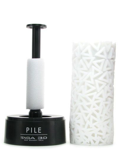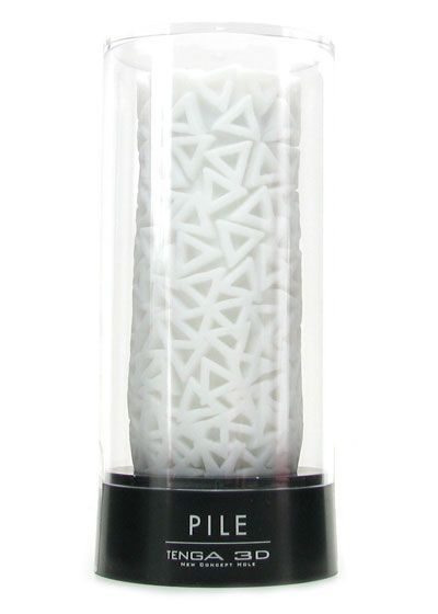 An ultra unique masturbator from innovative Tenga, this Japanese designed self love must-have perfectly combines aesthetics with undeniably pleasurable functionality. A pure white sleeve is textured in never before seen 3 dimensional patterns- you can see see exactly what you'll be feeling, as what seems to be the exterior, at first glance, is actually the interior. Once flipped inside out, you'll be faced with a smooth, nondescript surface that hides the true purpose discreetly within. The Pile version is; quoting Tenga, described as 'triangular protrusions packed tightly at the base and spaced out at the tip bring around a gradient of stimulation providing an escalating sensation of soft and hard pleasure.' In laymen's terms, raised, soft triangles will rub and massage you as you stroke, they're specifically spaced out for maximum stimulation that you'll need to feel to believe. Aside from the intense texture, the Pile is close-ended, which allows exciting suction to build up naturally as you thrust. Made from safe, soft, antibacterial elastomer, this nonporous material is incredibly easy to clean and maintain, plus, it warms up quickly to body temperature as you play, providing a feel that almost exactly mimics real skin. You'll be able to use both water and silicone based lubricants with your Pile, just avoid oil based products as they can degrade the elastomer over time. You'll adore how easily hits masturbator stores away on the included stand, which also keeps the sleeve upright so it dries faster after cleaning. Tenga 3D masturbators are 4 1/2 inches long, with a good bit of stretch, accommodating most men. It's about 6 inches around, with a width of 2 inches.