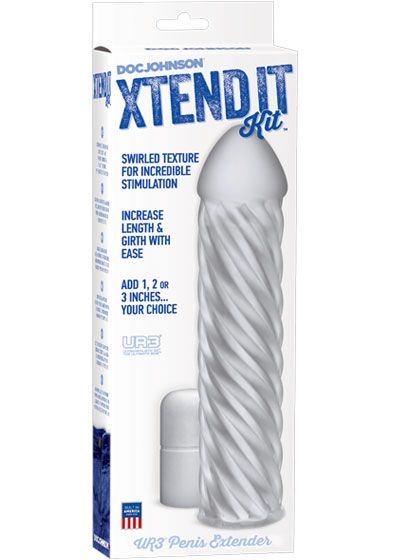 Get ready for a UR3® penis extension kit with stimulating pleasure swirls! The swirl texture provides incredible arousal while the sleeve extends length and enhances girth. Each Xtend It DIY kit includes a swirled hollow 8” sleeve, featuring a 1” extension already built into the firm head, and a plush 2” extension for inserting into the tip of the sleeve. Simply trim the ends of each UR3® piece for 1”, 2”, or 3” of a completely personalized penis extension. Available in Swirl, Ribbed and Realistic options. Made of phthalate-free body-safe material with Doc Johnson’s antibacterial Sil-A-Gel™ formula. Proudly Made in America.