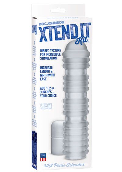 Get ready for a UR3® penis extension kit with stimulating pleasure ribs! The ribbed texture provides incredible arousal while the sleeve extends length and enhances girth. Each Xtend It DIY kit includes a ribbed hollow 8” sleeve, featuring a 1” extension already built into the firm head, and a plush 2” extension for inserting into the tip of the sleeve. Simply trim the ends of each UR3® piece for 1”, 2”, or 3” of a completely personalized penis extension. Available in Swirl, Ribbed and Realistic options. Made of phthalate-free body-safe material with Doc Johnson’s antibacterial Sil-A-Gel™ formula. Proudly Made in America.