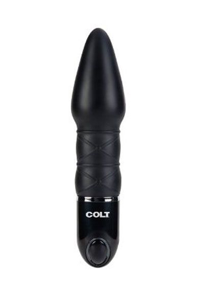 Colt Vibrating Slider - Black and High Intensity Bullet Vibrator Combo. Man sized heavy duty tapered and ribbed Silicone vibrating probes. 10 functions of intense vibration pulsation and escalation. Easy touch controller with LED. Hold for 3 seconds to turn off. Single-speed, multi-function and waterproof. Make your evening special tonight.