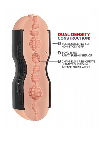 Get a TIGHT grip on your next stroking session with this incredible dual-density stroker! Experience the tightest, softest, most realistic masturbator on the market with the Tight Grip Dual-Density Squeezable Stroker. Made from our ultra-lifelike Fanta Flesh on the inside and our specially formulated Tight Grip TPR on the outside, this super soft stroking sleeve features a firm outer construction that allows you to get a tight grip and perfect squeeze every time. The ergonomic shape feels great in your hands and won`t get slippery or sticky, allowing you to get a perfect stroke even when your hands are lubed up! Mind-blowing textures! Slide into the super-soft Fanta Flesh and enjoy intense stimulation, lifelike sensations, and explosive climaxes. The tunnel of the realistic sleeve is lined with canals, ribs, and tiny love nodules that tease and surround your cock with each stroke. The super-soft Fanta Flesh is velvety smooth on the inside, wraps around you like a second skin, and warms to your body heat.