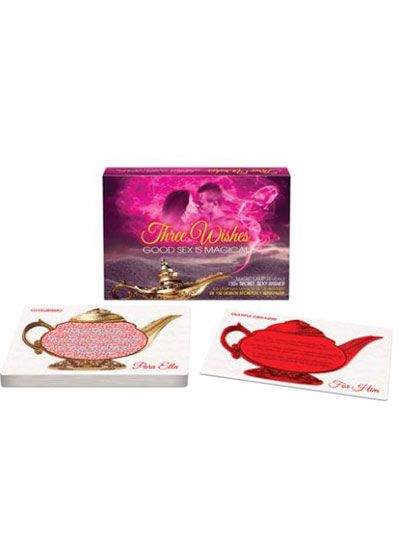 The genie grants one of the three wishes per card, as revealed by the lamp reveals.