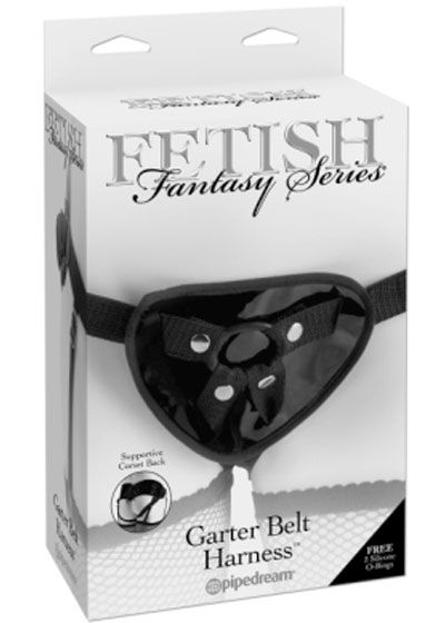 When you are looking for an affordable strap-on harness that can do it all, the Fetish Fantasy Series harnesses are just what you need to get the job done. Pipedreams has re-imagined our best selling harness designs, improving them with even better shapes and materials to offer the best range of harnesses for beginners and strap on aficionados alike. Compatible with most dildos, these harnesses perform best with Pipedream's Fetish Fantasy Elite Suction Cup Dildos and Basix Suction Cup Dildos. Designed with comfort and style in mind, the Garter Belt Harness features a sexy lace up corset style back that offers exceptional support, and four completely adjustable and removable garter straps that easily clip onto the included fishnet thigh highs. The soft materials prevent chafing and feel great against your skin, while the 4-way adjustable straps fit waists up to 44 inches and thighs up to 40 inches. Four metal snaps secure the O Ring and hold everything in place even when the action heats up. The three included silicone O Rings allow you to interchange a range of dildos with a diameter up to 2 inches. Garters and stockings included. Item Weight 5.75 ounces. Shipping information: Package Depth 3 inches, Width 5.5 inches, Height 9.25 inches. Packaged Weight 9.25 ounces. Package Type Box. Materials: Straps Nylon, Body PVC, Lining Polyester, Hardware Plastic, Garter Straps, Elastic Hardware Metal, O Rings Silicone, Stockings Nylon.
