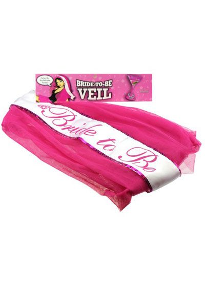 Bride To Be Veil Pink from Little Genie Productions. Beautiful 3 feet Hot Pink Veil! Super cute Bride To Be Veil is great for playing dress up long before you stroll down the aisle. This beautifully hand sewn pink veil is layered with tulle and incorporates a satin printed sash. It's the perfect Bachelorette party accessory that is sure get the Bride-To-Be the attention she deserves. Adventurous Bachelorettes can even spice up their night by using safety pins to attach suck for a buck candies and decorative condoms. Not included. Sold separately. Contents: 3 foot long veil with sequin sash.