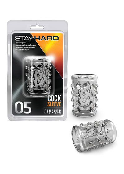 Stay Hard Cock Sleeve 05 Clear. This stretchy enhancement sleeve is a simple way to add a new level of pleasure and sensation to your rod or favorite dildo. Just slide the sleeve over your shaft. Easy to use, and stays in place! Specifications: strong and stretchy. Textured for intense stimulation. One size fits most. 6 shapes and textures to try! Phthalate and latex free. TPE material. Length 2.04 inches. Diameter: 1.57 inches. Circumference 4.92. Product weight without package .4 ounce.