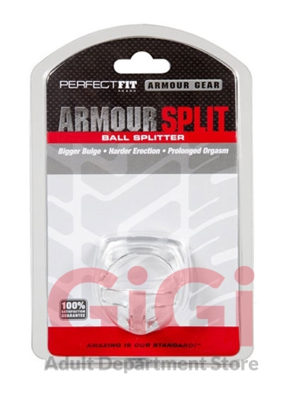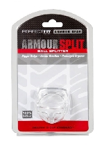 Armour Ball Splitter Ring Black. Made of PF Blend a proprietary blend of Silicone and Thermoplastic Rubber TPR developed to provide superior stretch, comfort and durability. Safe with water based lubes wash thoroughly with mild soap and water. Not compatible with latex. Store separately. Perfect Fit Brand Products are sold, and intended for use strictly as adult novelty toys for entertainment. They are not intended for medical use and have not been clinically tested. No medical claims are warranted or implied by the use of these products.