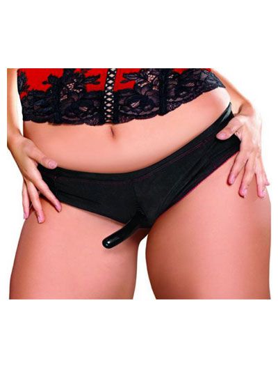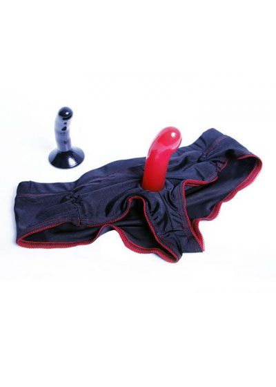 Strap on in style! This sexy scarlet and black plus sized boy shorts panty lets you comfortably strap on full sized dildos. Forget about adjusting buckles and straps; the supportive, smooth panty lets you get right to your fantasies. This starter set includes two colors and sizes of dildos for beginning and more advanced play. Dildos clean easily with Adam & Eve toy cleaner. Perfect for strap on fantasies. Includes plus size boyshort panty and 2 dildos. Soft and stretchy panty with strap on opening. Made from polyester, elasthane. Machine washable. One size fits most plus ladies 14 to 20. Black beginner’s dildo 4.5 inches by .8 inch. Red advanced dildo 5.5 inches by 1.25 inches.