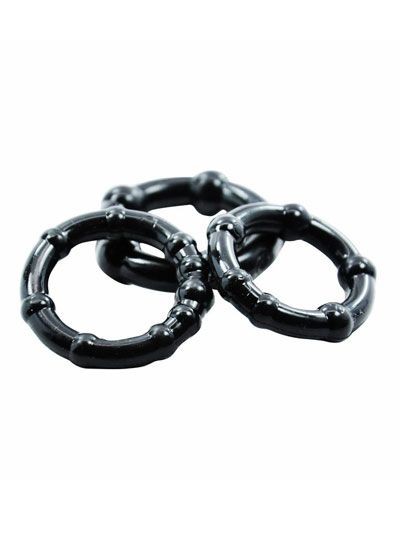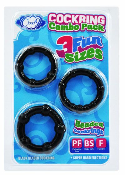 Cloud 9 Novelties Super Stretch Beaded Stay Hard Ring Combo Pack Black includes three sizes of super soft skin safe rings.