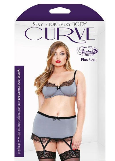 FL! Eyelash Lace Trim Bra Set with Matching Gartered Skirt & G-string Set Plus Size
