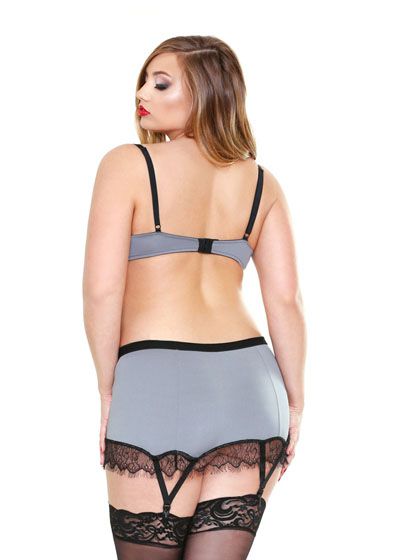 Nothing is sexier than this shade of grey microfiber and eyelash lace bralette set. Constructed with underwires, this alluring bra is paired perfectly with a matching skirt and vintage inspired garters. Matching G-string included to complete the set. (Does not come with stockings)