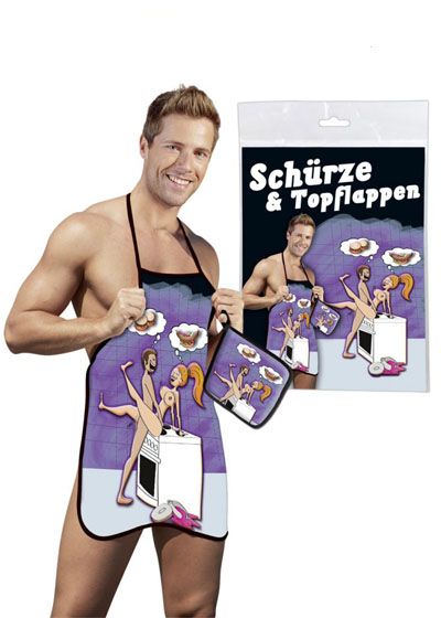 Cooking apron with a funny printing. Tie-up halter neck. Includes matching oven cloths. 100 percent polyester.