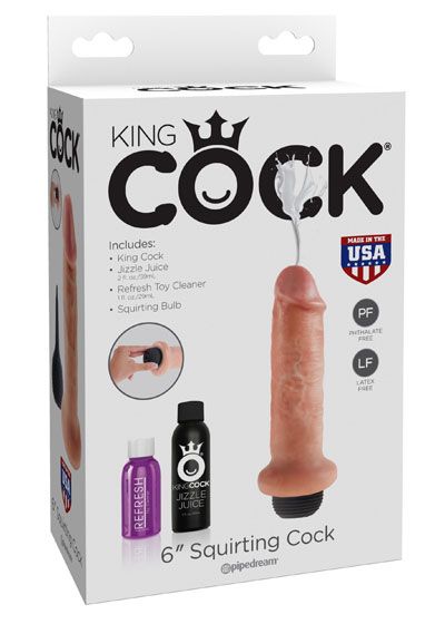 This King Cock Squirter is ultra-realistic and will satisfy all your cravings for cum-play! Hand-sculpted with amazing attention to detail and featuring our exclusive Jizzle Juice squeeze-bulb, the King Cock Squirters are the most satisfying ejaculating dildos on the market! Every King Cock Squirter is phthalate-free, latex-free, body-safe, hypoallergenic, and proudly made in the USA.