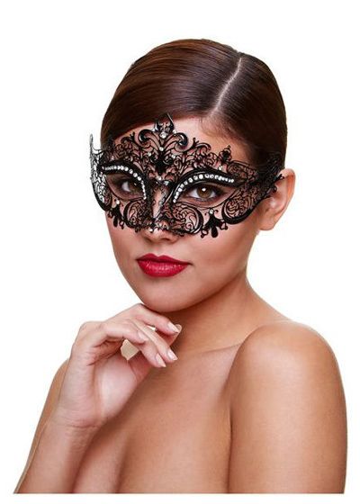 Black enameled filigree eye mask adorned with crystal elements. Its delicate metal structure offers gentle flexibility for a perfect fit on the face, and features black satin ribbon ties for secure wear.