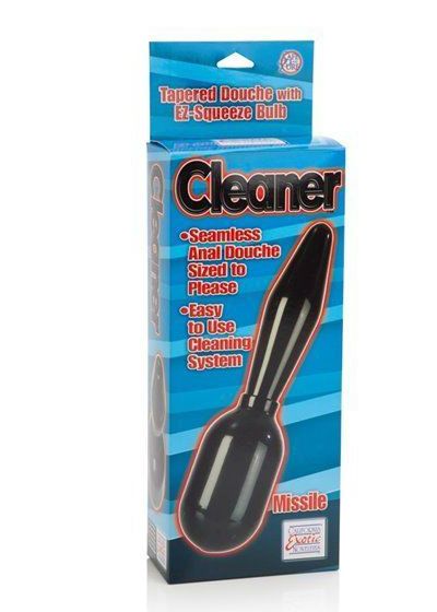 Keep it clean, buddy! This sleek and seamless 4.75" x 1.25" anal douche is easy to use and made for comfort. Soft and pliable with a tapered end, the Missile is a complete hygiene system. Cleaner Missile is manufactured by California Exotic Novelties SE0377-10. Feature: Waterproof Material: PVC Color: Black Width: 1.40 Inches.
