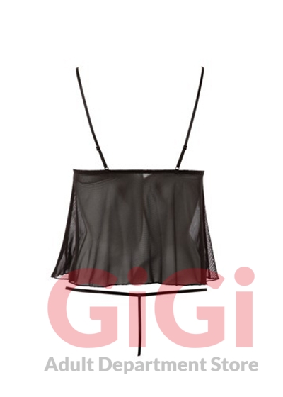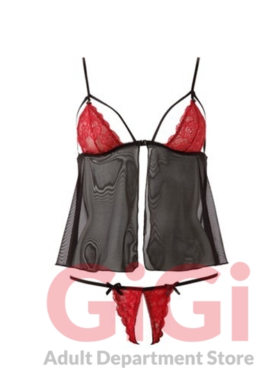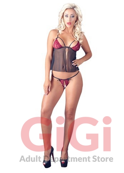 Short babydoll made of black powernet combined with red lace cups. Open at the front and a clip-fastener is there to fasten the babydoll. Adjustable straps. Includes a matching crotchless red lace string. 90% polyamide, 10% elastane.
