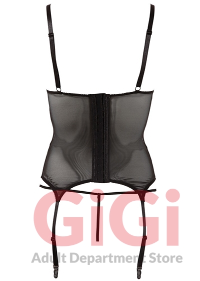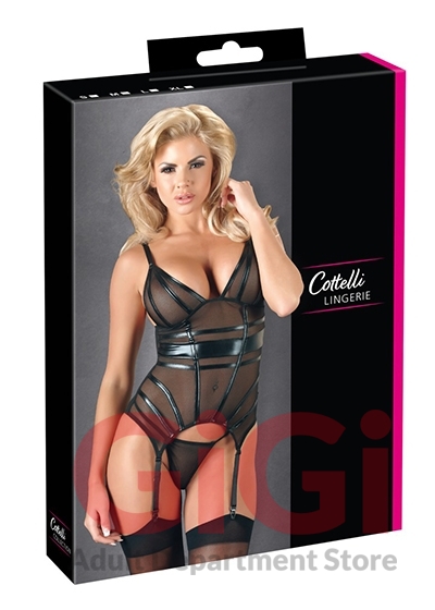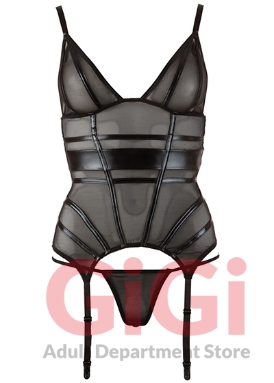 Black set made out of powernet with wetlook stripes. Basque with adjustable bra straps and four adjustable suspender straps. A hook- fastener at the back. 80% polyamide, 10% polyester, 10% elastane. Includes powernet string, 90% polyamide, 10% elastane.